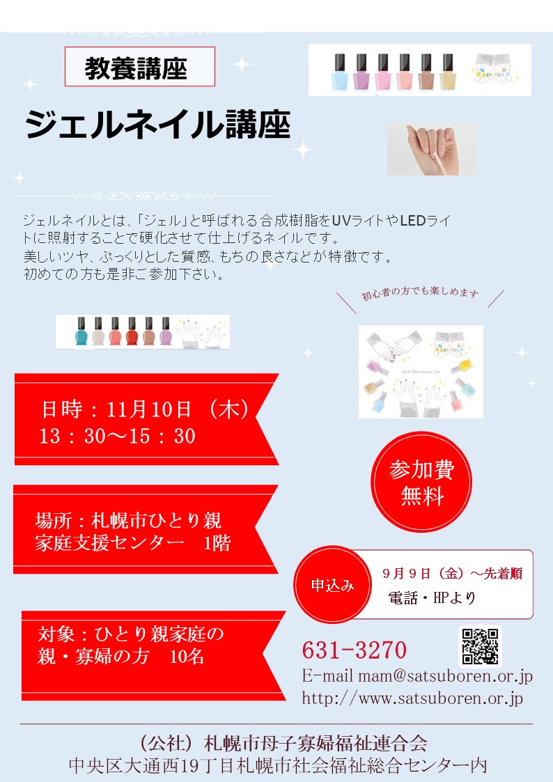 11/10日開催 教養講座「ジェルネイル講座」のお知らせ 2022年9月13日 下記お問い合わせフォームよりお申込ください。 お問い合わせフォーム – 公益社団法人 札幌市母子寡婦福祉連合会 (satsuboren.or.jp)